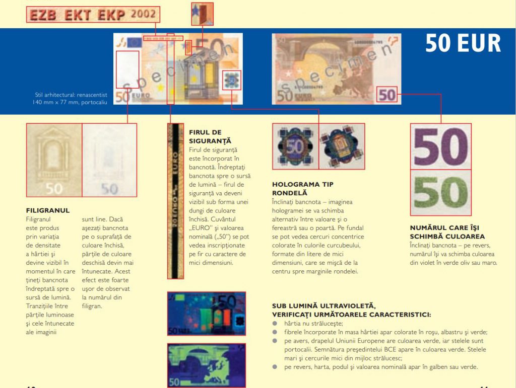 Afacerea bancnotelor false de 50 de euro: Bancnota de 50 eur din seria „europa. De asemenea, numarul bancnotelor de 50 de euro in circulatie este foarte aproape de totalul tuturor cupiurilor aflate in circulatie la finele anului 2002, anul toate aceste elemente de siguranta usureaza verificarea autenticitatii noii bancnote de 50 de euro prin metoda atinge, priveste, inclina.