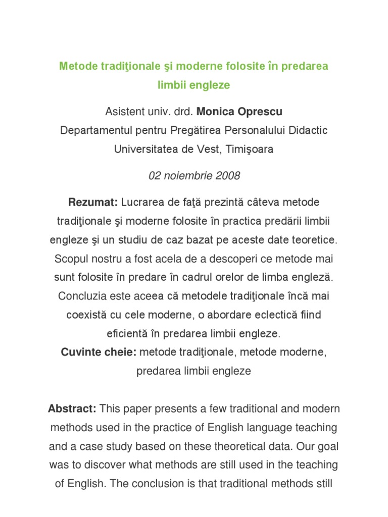Metode de evaluare a rezultatelor şcolare. Carti >> stiinte umaniste >> pedagogie metodica >> posibilitati de imbinare a metodelor didactice moderne cu cele traditionale in lectiile de matematica in conditiile in care se accentueaza tot mai mult caracterul formativ al procesului de invatamant, didactica moderna promoveaza, printre altele. Analizarea metodelor moderne si traditionale de predare este foarte importanta in activitatea unui cadru didactic deoarece prin intermediul lor se realizeaza procesul de invatamant.